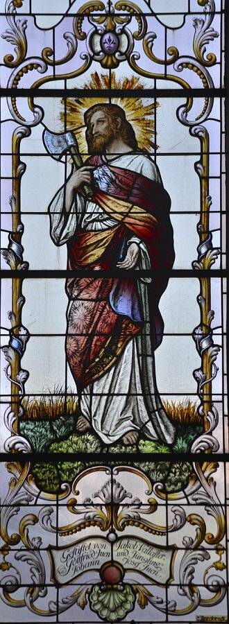 Apostel als Patrone für die Handwerker, Zimmerleute, Matthias mit Beil und Simon mit Säge; durch Beil und Säge konnte sich die lokale Bevölkerung gut mit den Aposteln identifizieren.